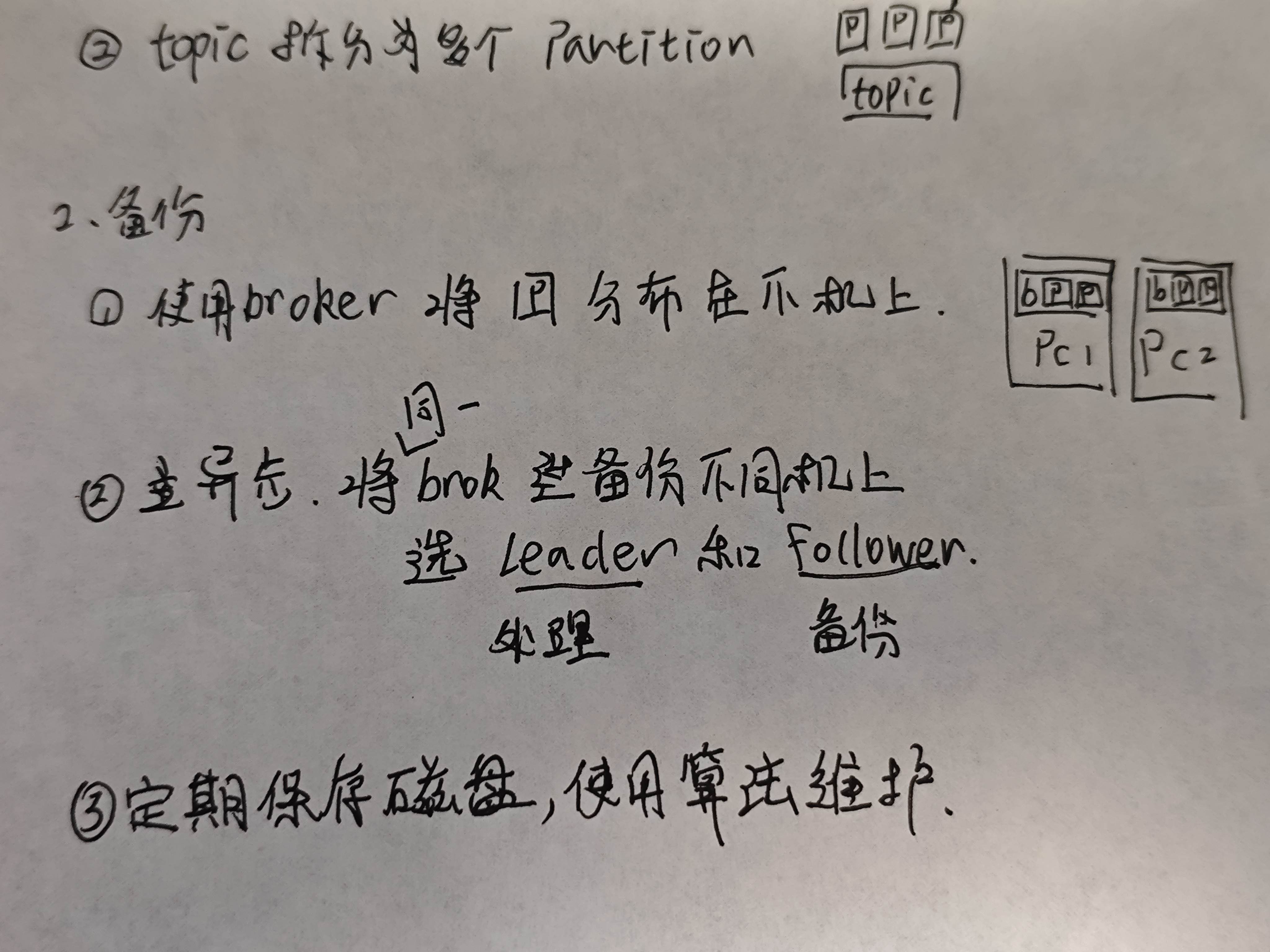 一般情况下,不做任何保证的broker可能会在机器宕机时丢失所有数据。 于是我们把partition复制成两份,一份叫做leader,复制处理信息队列,另一个叫folllower,同步leader的数据,并把他们分散在不同的broker中。 当一个leader挂掉了,follower会选举出新的leader。